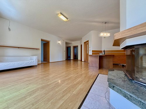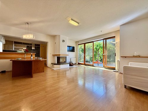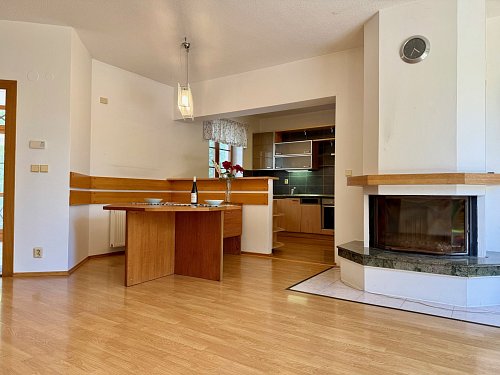 The interior layout is thoughtfully arranged as a 4+kk configuration, with a bright living room connected to the kitchen, forming the heart of the home. In winter, enjoy cozy moments by the fireplace; in summer, benefit from direct access to the terrace.